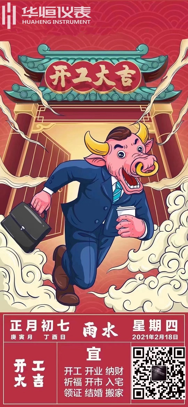 煙花炮竹喜慶吉祥,歡聲笑語團圓喜悅。2021年2月18日(正月初七)西安華恒儀表制造有限公司(以下簡稱:華恒儀表)新年第一天開工大吉,在這個吉祥的日子里,華恒儀表全體員工恭祝大家在新的一年里百事順遂、萬事如意、大吉大利、財源廣進!衷心感謝廣大客戶及合作伙伴一直以來對華恒儀表的關(guān)注與支持。
