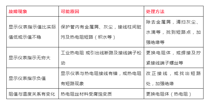 工業(yè)熱電阻的常見故障是工業(yè)熱電阻斷路和短路。一般斷路更常見,這是因?yàn)闊犭娮杞z較細(xì)所致。斷路和短路是很容易判斷的,可用萬用表的“×1Ω”檔,如測(cè)得的阻值小于R0,則可能有短路的地方;若萬用表指示為無窮大,則可判定電阻體已斷路。電阻體短路一般較易處理,只要不影響電阻絲長短和粗細(xì),找到短路處進(jìn)行吹干,加強(qiáng)絕緣即可。電阻體斷路修理必須要改變電阻絲的長短而影響電阻值,為此以更換新的電阻體為好,若采用焊接修理,焊接后要校驗(yàn)合格后才能使用。熱電阻測(cè)溫系統(tǒng)在運(yùn)行中常見故障及處理方法如下表:
