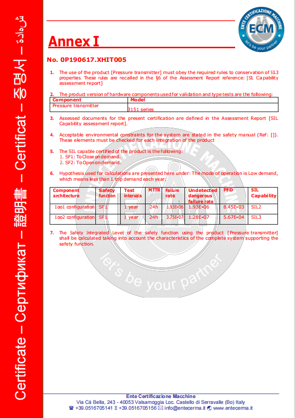 壓力/差壓/液位變送器SIL2(SIL3)認(rèn)證證書