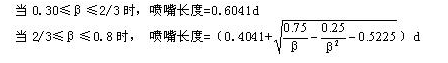 標(biāo)準(zhǔn)噴嘴由垂直于軸線的入口平面部分A、圓弧形曲面B和C所構(gòu)成的入口收縮部分、圓筒形喉部E和為防止邊緣損傷所需的保護(hù)槽F組成,其取壓方式上游采用角接取壓,下游可按角接取壓設(shè)置,也可設(shè)置與較遠(yuǎn)的下游處。噴嘴總長(zhǎng)度: