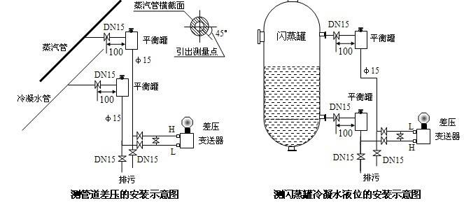 2、測量液體流量時,差壓變送器應(yīng)安裝在被測管道的旁邊或下面,以便氣泡排入管道中;或上面,以便積聚的液體容易流入管道中;下面,以便冷凝水能充滿在引壓管中。